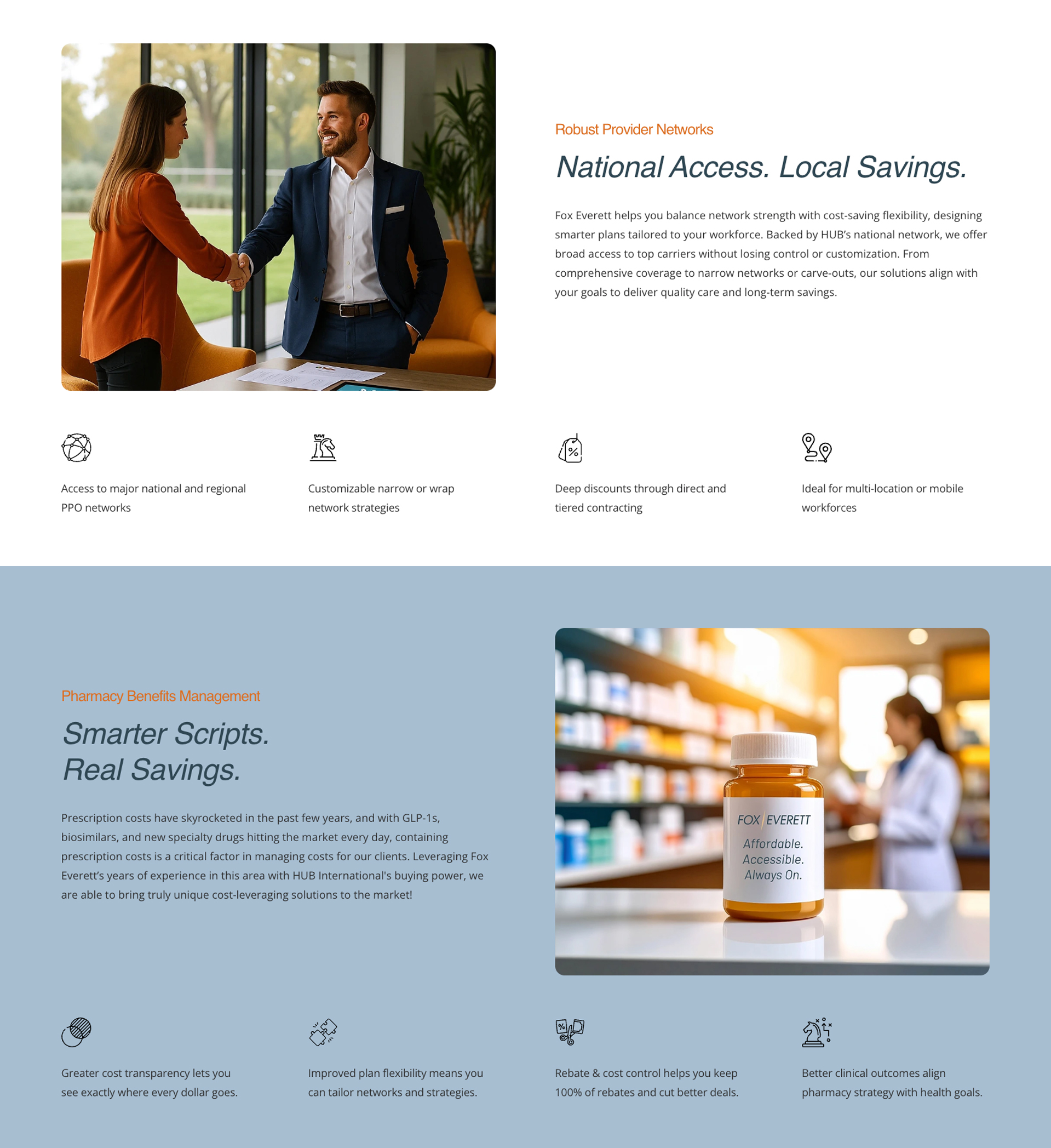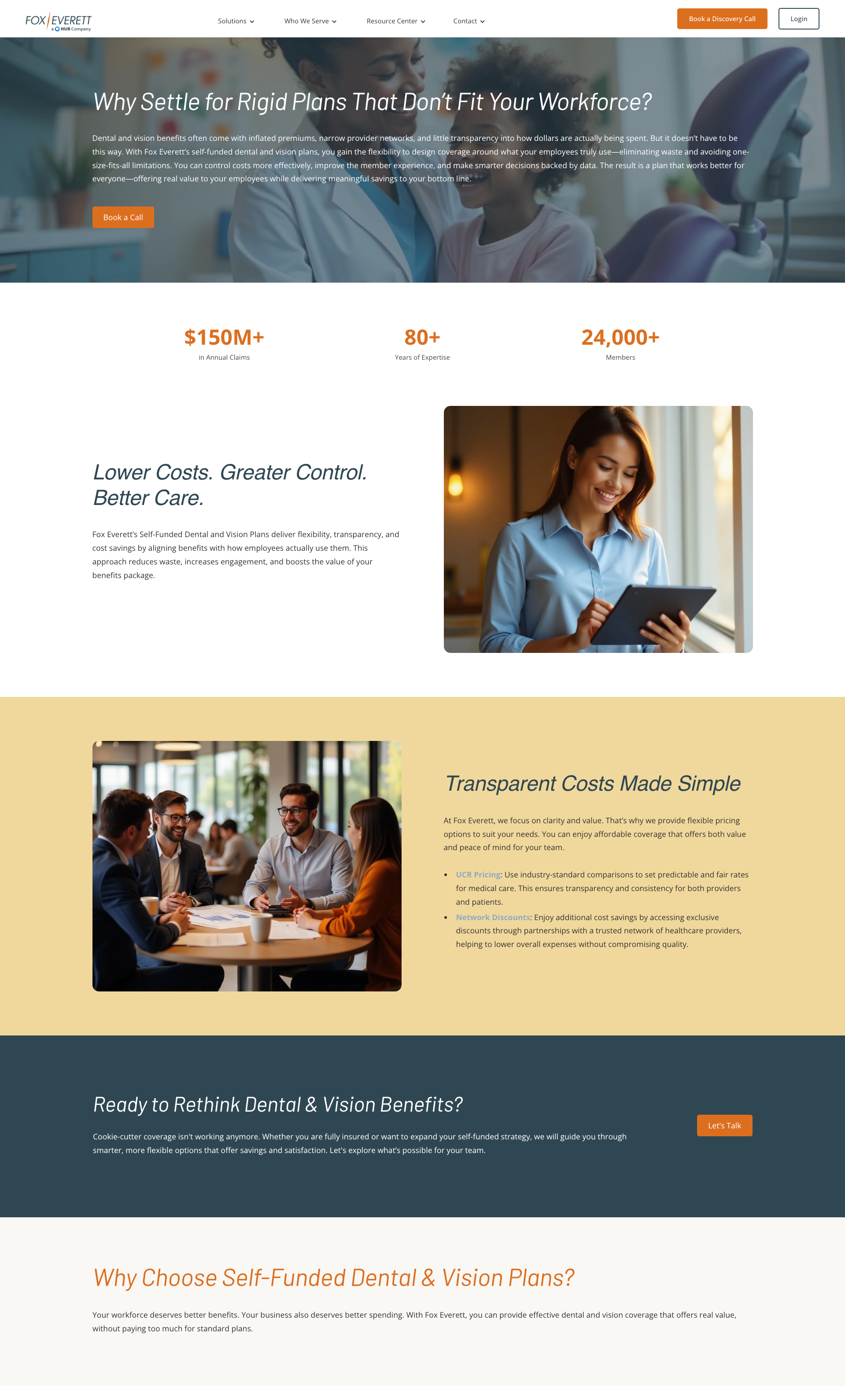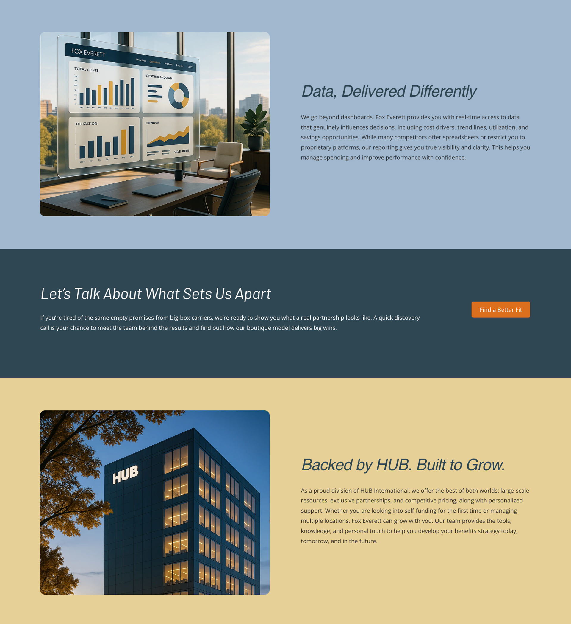 I created a complete brand transformation for Fox Everett, a boutique insurance and benefits company. Starting with a fresh identity and carrying it through the full design and development of their new website, every detail was built with intention. The result is a digital presence that feels seamless, elevates the brand, and delivers measurable results. By combining data driven strategy, seamless flow, and brand elevating visuals, the final product does more than look polished, it delivers results.